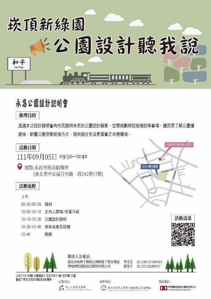 公園處吳文慶總工程司表示,本次公園規劃利用高程緩坡的變化,將新、舊公園的縫合,並以透水鋪面排列形式及時光輿圖地景廣場,塑造懷舊的萬新鐵路「和平站」,提供市民在地文化底蘊的休憩空間。
