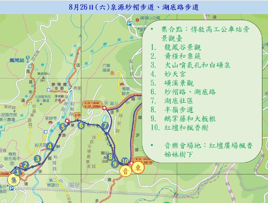 大地處表示,活動當日早上8點,在惇敘高工公車站旁景觀人行道集合出發,經過龍鳳谷遊憩區,看看昔日採硫礦留下的蓄水池,接著進入泉源紗帽步道沿磺溪往上游續行。途中可見後火山地形景觀,如硫磺噴氣孔、硫磺結晶和白磺泉引水區,以及磺溪和野溪溫泉遺跡,除了認識陽明山重要的地質,也可以瞭解當地的溫泉發展歷史。而後由紗帽路、湖底路及半嶺水圳步道到達紅壇小廟。紅壇也稱為天上廟,是個小巧特別的紅磚廟宇建築,平常無供奉神明,只有在陽明山區有廟會拜拜時才會開門迎神明進駐。