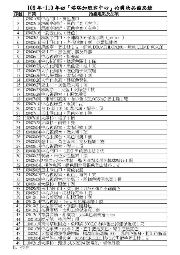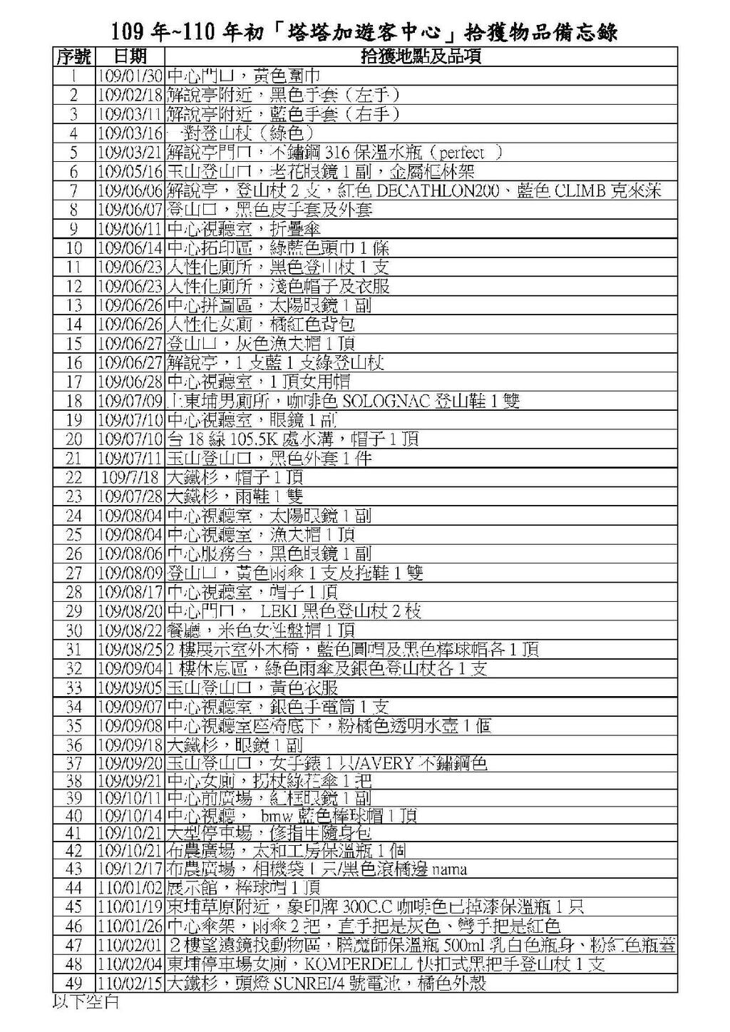圖說1:「塔塔加遊客中心」109年~110年初拾獲物品備忘錄