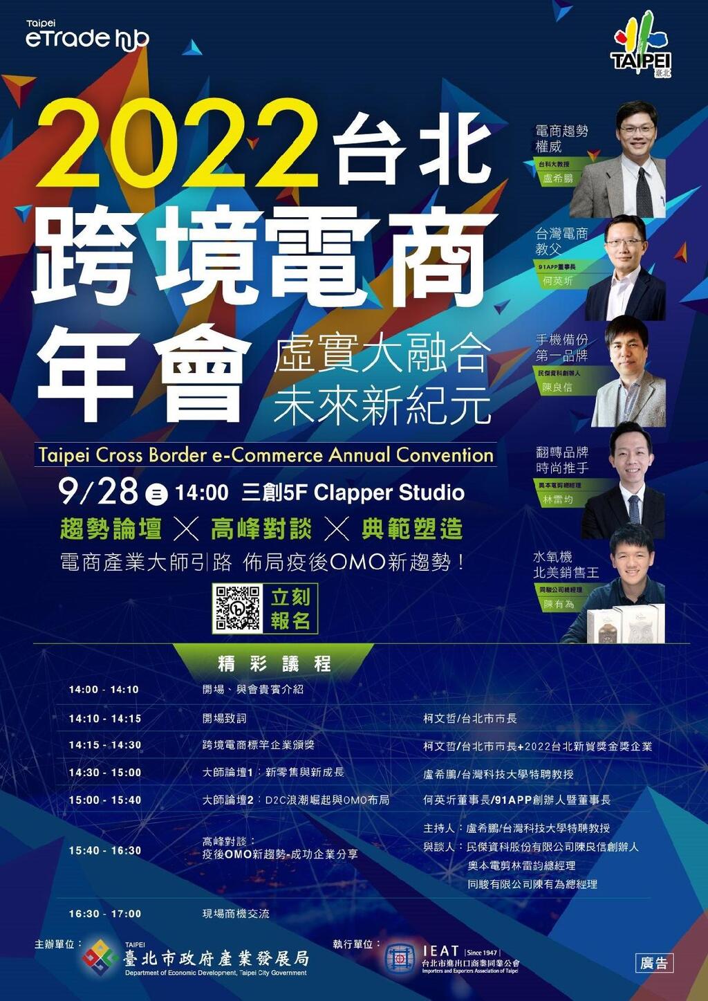臺北市政府主辦的「2022台北跨境電商年會」,將於9月28日下午2時在三創生活園區5樓CLAPPER STUDIO隆重登場,今年以「虛實大融合 未來新紀元」為主題,聚焦討論跨境電商新零售的未來趨勢,邀請國際電商界產業大師引路,現場將邀請到91APP創辦人暨董事長何英圻、台灣科技大學盧希鵬教授等電商產業大師,針對疫後OMO虛實融合提出重要觀點,想掌握第一手的市場數據與趨勢的企業,千萬別錯過!