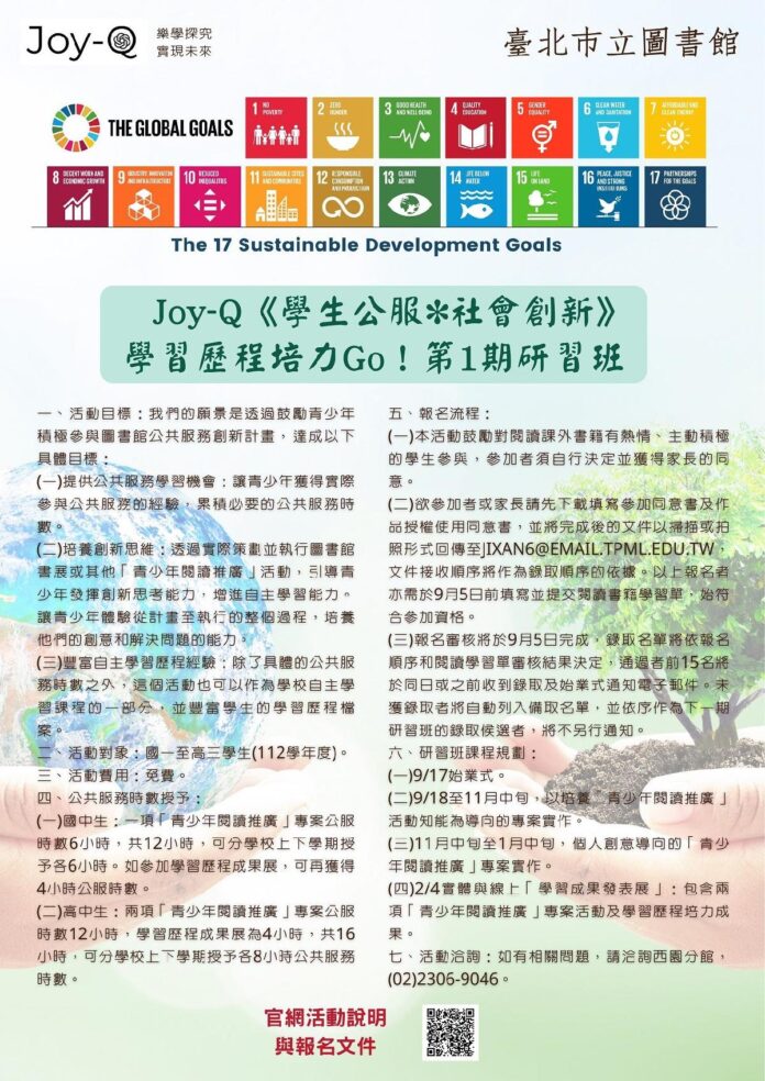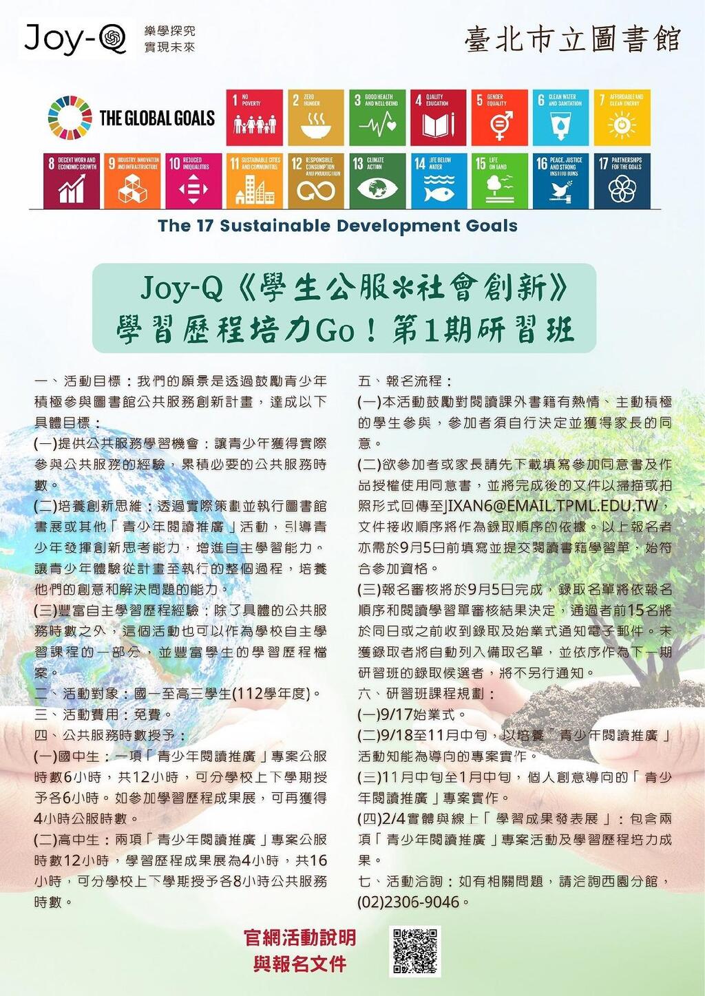 臺北市立圖書館致力於創造閱讀樂趣並提升青少年學習興趣,特別推出Joy-Q《學生公服*社會創新》學習歷程培力Go!第1期研習班。透過社會創新實踐,引導國一至高三學生參與培力型公共服務,並豐富他們的學習歷程。此項計劃現已開始接受報名,活動網址為https://tinyurl.com/3n2938t3。