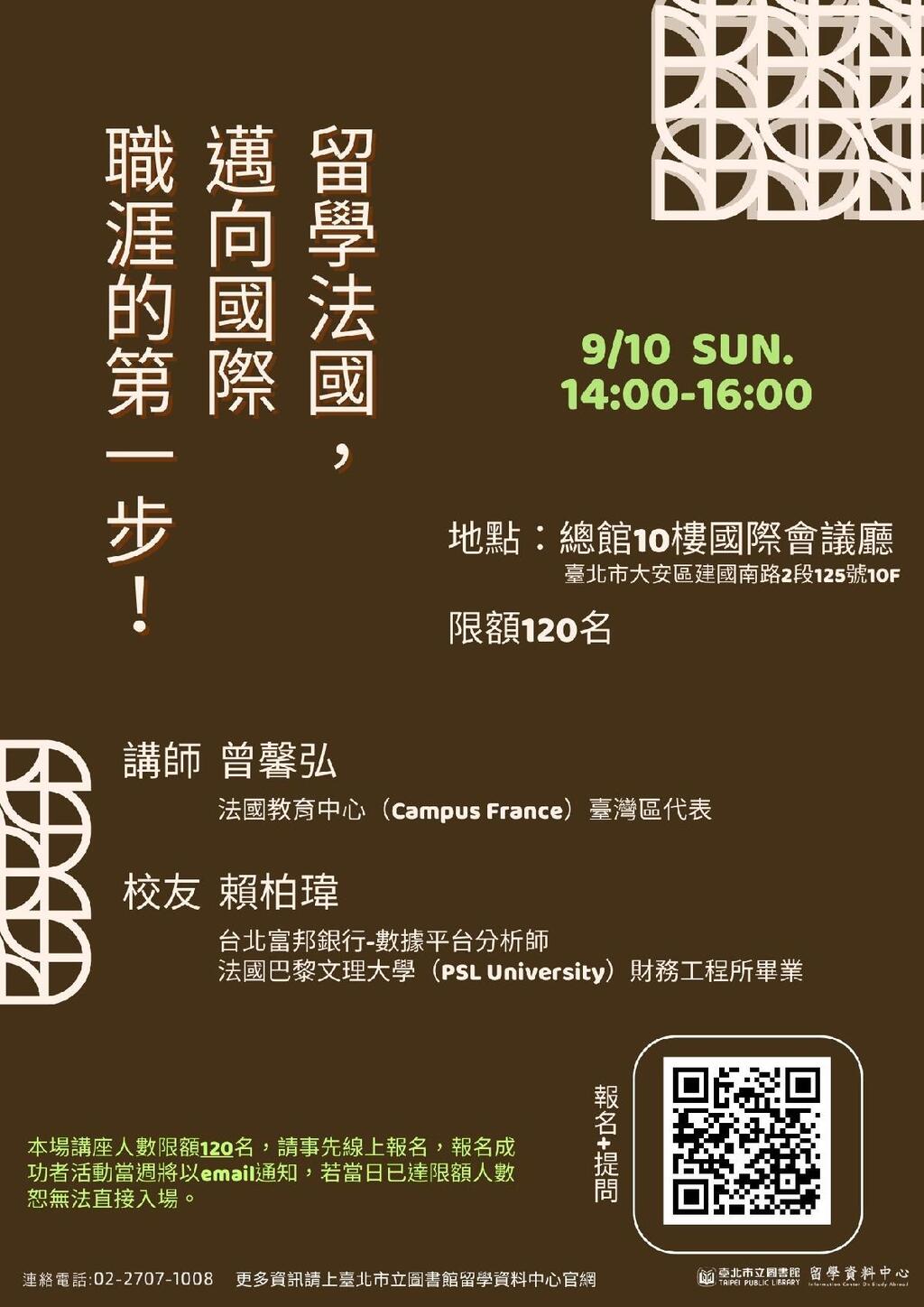 北市圖總館留學資料中心於9月10日(日)14:00邀請法國教育中心曾馨弘代表帶您了解法國高等教育制度、如何以臺灣文憑申請法國學校、留法生活帶來的生命體驗,以及完成法國學業後的未來發展可能。同時本次講座亦安排留法校友現場分享,講述在法學習與生活經驗,由賴柏瑋講師分享法國巴黎文理大學財務工程所碩士班學習經驗與課程內容介紹,當地日常生活訣竅,實習經驗以及留學帶給自己的啟發。