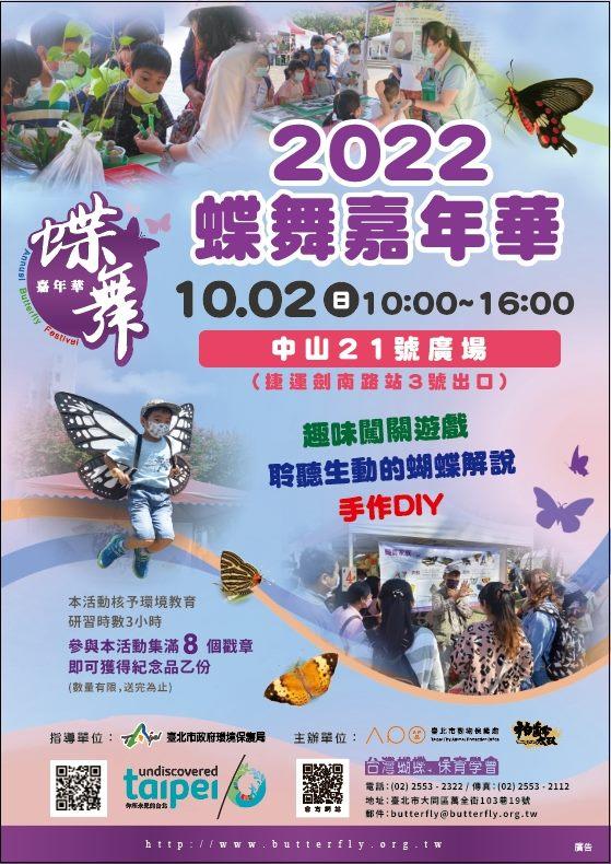 蝴蝶不只是活躍在春、夏季的專屬天使,臺北市動物保護處與社團法人台灣蝴蝶保育學會為了讓市民朋友們認識蝴蝶在生態環境中扮演的角色,於111年10月2日星期日上午10時至下午6時,在位於捷運文湖線劍南路站3號出口旁的中山21號廣場中的劍南蝶園舉辦「2022蝶舞嘉年華」,並進行精彩的戶外蝴蝶生態解說、充滿童趣的手作DIY課程與饒富知性的生態解說等免費活動,歡迎小朋友帶著爸爸、媽媽一起來闖關拿獎品!
