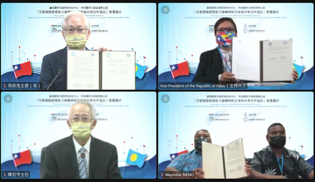 帛琉國家災害管理辦公室(National Emergency Management Office, NEMO)與國家科學及技術委員會(國科會)行政法人國家災害防救科技中心(災防科技中心),以「建置智慧化防災監測、強化防災決策及訓練」為主軸,於111年8月30日下午2時於國科會會議室透過即時連線,在國科會吳政忠主委及帛琉副總統席嫵杜(J. Uduch Sengebau Senior)女士見證下,共同簽署「災害風險管理能力建構與防災技術共享合作協定」。曾大使瑞利代表外交部,親自出席國科會簽約現場觀禮。