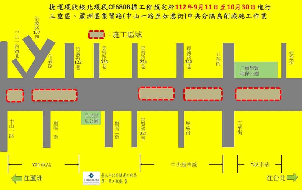施工單位將自112年9月11日至112年10月30日間進行蘆洲、三重區集賢路Y21車站(中山一路口至集賢路378號)及Y22車站與中央避車線(由集賢路224巷口至如意街間)之中央分隔島削減、路燈拆除及路面刨鋪作業,施工範圍,如附圖。