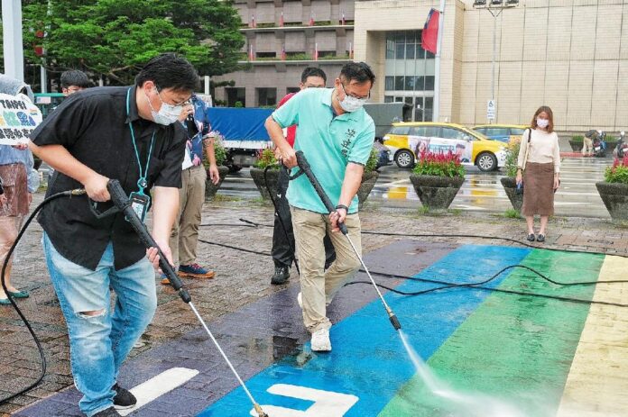 觀傳局首度邀請工人作家林立青與無家者們組成的「友洗社創」一同打亮市府前彩虹地景。