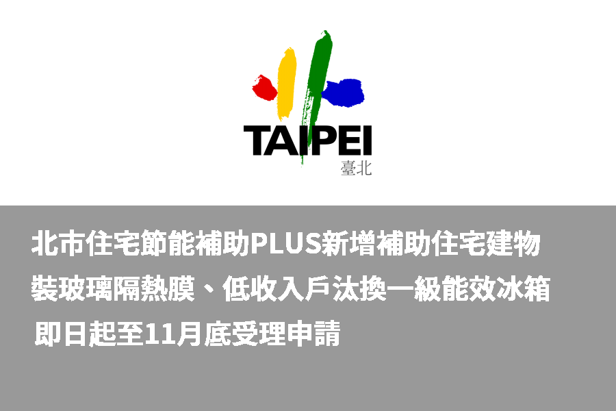 為鼓勵臺北市住宅、社區加速能源轉型邁向淨零未來,臺北市環保局今(112)年辦理「臺北市住宅社區創能儲能及節能補助計畫」,補助住宅、社區建置相關設備,推展分散式發電。即日起至11月30日(或計畫經費用罄),新增補助住宅裝設建物玻璃隔熱膜,每戶補助上限3萬元,以減輕室內空調負荷達節能功效。同時,落實公正轉型也新增補助低收入戶汰換1級能效冰箱,最高補助1萬5,000元。