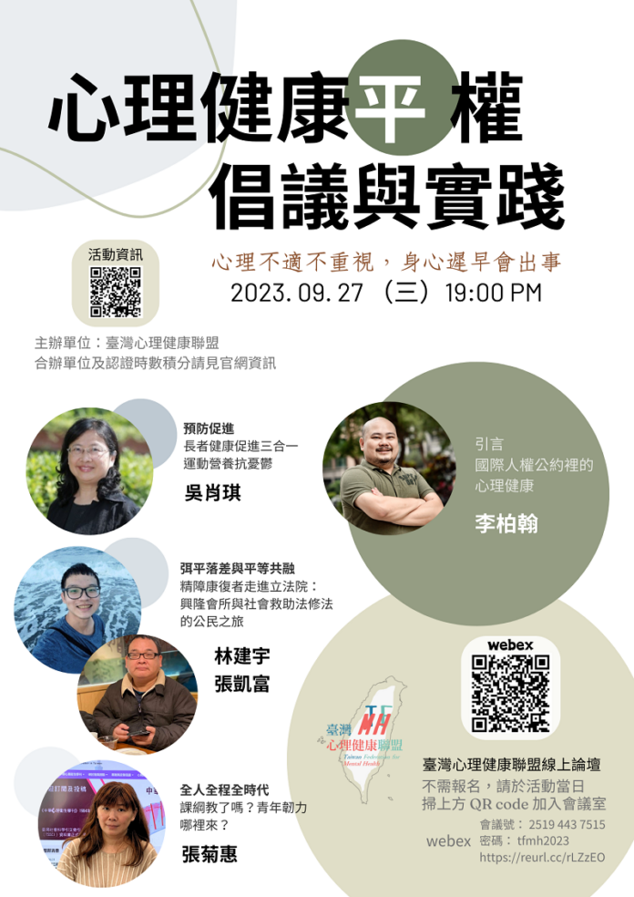 臺北市青少年發展暨家庭教育中心關心市民的家庭心理健康,9月27日與中華心理衛生協會等單位合作辦理「心理健康平權倡議與實踐」線上論壇,與談主題包含:「國際人權公約裡的心理健康」、「長者健康促進三合一:運動營養抗憂鬱」、「精障康復者參與修法的公民之旅」、「課綱教了嗎?青年韌力哪裡來?」等內容,參與論壇完全免費,不需報名,只要在9月27日週三晚間7點至9點,點選會議室連結,即可直接參加!(https://ntucc.webex.com/ntucc/j.php?MTID=mda45172fefc9f22191420ac8e7c37f1a)