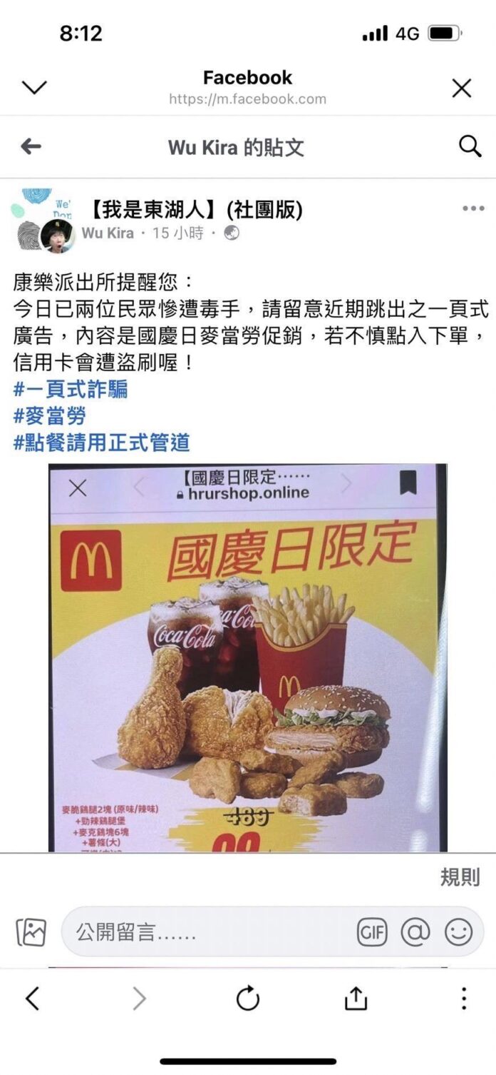 北部新聞台北市有關多起民眾報案,有關遭一頁式廣告詐騙一案 北部新聞台北市 有關多起民眾報案,有關遭一頁式廣告詐騙一案 編輯 林 曉君 2023-10-09 本案係劉姓民眾及許姓民眾,分別於網路發現一頁式廣告,廣告內容稱原價499元套餐,因慶祝國慶特惠99元,民眾不疑有他,輸入信用卡號及OTP碼後,發現刷卡金額分別高達7000多及5000多,始發現遭到詐騙,故至康樂派出所報案,全案依詐欺罪積極偵辦中。 內湖分局呼籲民眾,在進行網路購物時,應避免於一頁式網站中進行購物,防止遭騙,如有疑慮可撥打反詐騙專線165或撥打110報案電話查證。 延伸閱讀 商情 想同時增肌又減脂?年後體態管理關鍵曝光 客製高蛋白營養方案助代謝重啟 商情 年後減肥不挨餓!台北中山區高蛋白健康餐推薦 助上班族重啟代謝找回體態 商情 年後體態管理怎麼做?專家推高蛋白健康餐助攻代謝重啟,台北中山區減脂餐新選擇 商情 台中機械五金批發賣場推薦|益佃五金提供全方位刀具、量具與客製化服務,全台速配直送