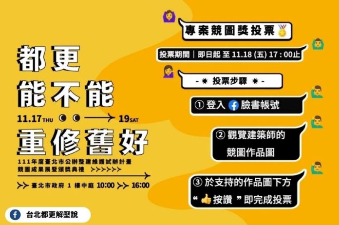 北市都更處今(111)年首推公辦整建維護試辦計畫(下稱試辦計畫),在累積了一整年與市民的溝通成果後,即將於11月17日至19日於市府1樓中庭舉辦「都更能不能重修舊好」專案競圖成果展暨頒獎典禮。此外,成果展系列活動的前哨戰,自即日起正式開跑,民眾只要在11月18日之前,至「台北都更解壓說」FB粉絲專頁線上投票,即可用自己神聖的一票決定百萬競圖獎金的得主。