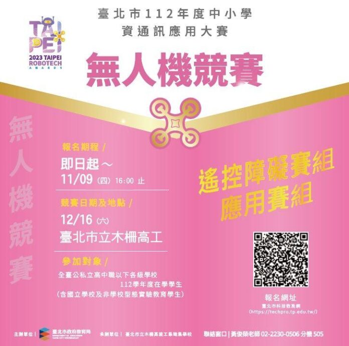 【臺北報導】隨著無人機產業及相關技術迅速發展,無人機應用面向亦越來越多元,包含環境監測、基礎建設檢查、事故救援協助等應用,於解決各種社會問題扮演關鍵角色,為激發學生學習興趣,提供實踐應用的機會,臺北市政府教育局112年度特辦理「中小學資通訊應用大賽-無人機競賽」,競賽內容包含「遙控障礙組」及「應用賽組」等2大項目,遙控障礙組針對初階及具一般操控能力選手,在指定競賽場地進行障礙穿越、競速及累積積分等操作,考驗選手操作熟練及流暢度;應用賽部分特別融入現實生活情境,考驗選手數位科技、無人機操縱技術及問題解決等綜合資訊能力!賽事採線上報名,報名即日起至112年11月9日(星期四)下午4時,歡迎全國好手共襄盛舉,踴躍報名參加!