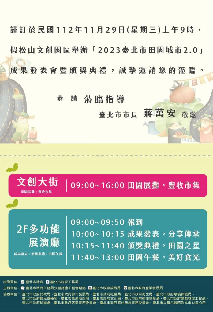 臺北市推動田園城市,截至112年 10 月底,本市田園基地處數已達 739 處,耕作面積已達20 萬 3 千多平方公尺,累計耕作人次已達 42 萬多人次,成果斐然。臺北市政府將於112年11月29日上午9時於松山文創園區文創大街和2F多功能展演廳,辦理田園城市市集展攤及頒獎典禮以及成果發表,由蔣市長親自頒獎給得獎單位,並且表揚優良企業及快樂園丁。歡迎媒體朋友蒞臨採訪