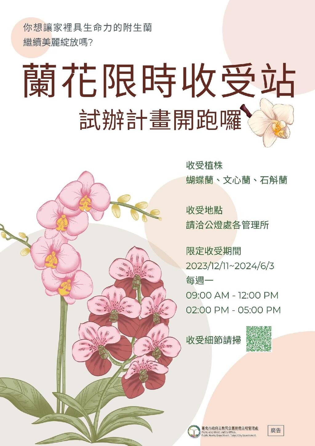 北市公園處於112年12月11日起至113年6月3日為期半年,推出「蘭花限時收受站」試辦計畫,民眾家中倘若有無法照料的附生類蘭花,可捐贈送交公園處,由專業園藝人員養護後種植於公園內,為公園營造多樣化的賞花景緻。此試辦計畫將持續半年,歡迎市民踴躍參與,共同期待美麗的蘭花綻放於臺北市的公園。