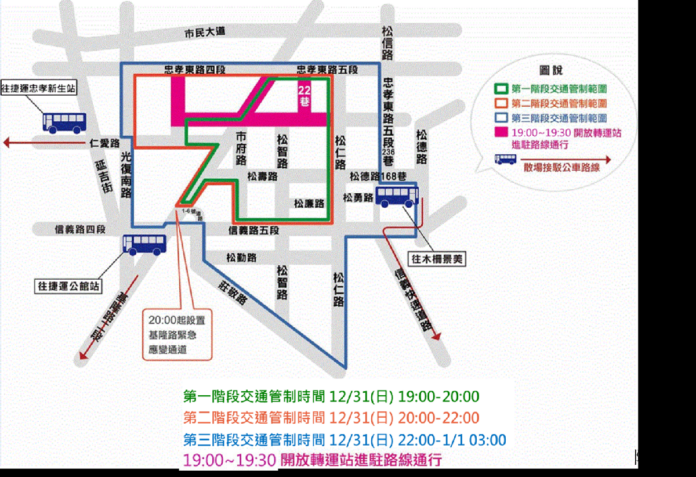 四、市府轉運站自12月31日19時30分起車輛管制禁止進入,旅客須至管制區外的替代站位搭車。市府轉運站地下連通道(自12月31日21時起)、微風信義地下連通道、台北101/世貿捷運站地下連通道(以上自12月31日22時起)關閉。