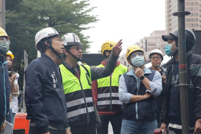 「臺北最High新年城-2024跨年晚會」即將到來,臺北市政府勞動局長高寶華今(28)日上午率勞檢處同仁,前往市府前跨年舞台勞檢舞台搭設作業,要求承作廠商確實依職業安全衛生法相關規定,落實施工防護安全。