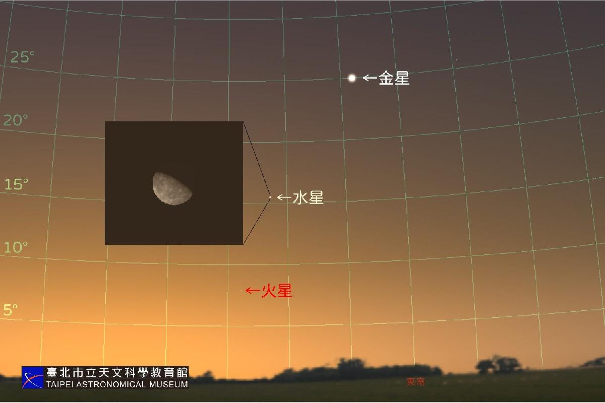 水星在1月12日的西大距時與太陽離角約23.5度,日出時仰角約19度高。不過在大距前一日,也就是11日的日出時,水星仰角可達約19.5度,比大距當天還略高,觀賞條件更好。因此在大距前後幾天的破曉前,都很適合在東南方低空觀賞水星,此時天空中最亮的是金星,水星就在它的左下方,較暗的火星則在更低處,三者排成一條弧線,早起的朋友不妨找找看這三顆地球的鄰居。相關天象資訊請參閱天文館網站「天文知識」項下「天象預報」網頁。