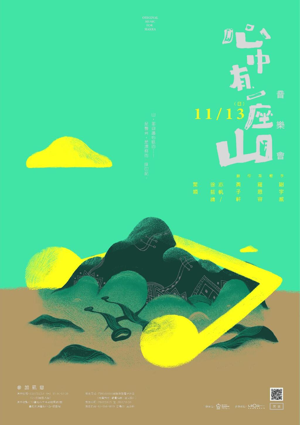 臺北客莊音樂影像故事」自2018年以來,不斷探索呈現都會客家人的漂移脈絡與生根故事,今年再以《心中有一座山》為題,邀請金曲獎音樂人謝宇威、羅思容、黃子軒、徐哲緯、亦帆、葉穎,攜手探訪臺北山林客家農場,共創當代客家音樂,勾勒都會客家人心中的那一座山。專輯並邀請金曲製作人黃培育操刀製作,更搶先在正式發行前,於11月13日下午3時30分,在臺北表演藝術中心球劇場盛大舉辦音樂會,邀請觀眾共下體驗心中的一座山。