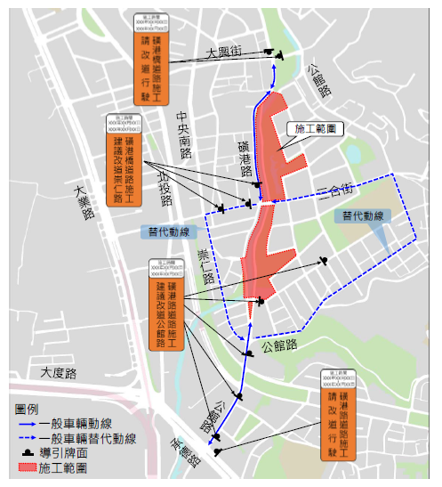 另外, 關於磺港溪再造工程施工期間週邊的替代通行動線,北投工務所指出,這工程預計於今年7月31日完工,將完成磺港路南端磺港橋及三合橋新建,並開放西側全段磺港路雙向通行,完工後,道路將全數恢復往常供用路人使用,水利處也再次籲請來往車輛配合動線行駛,並依指示牌面及交通指揮人員引導行駛,改道期間造成諸多不便,還請市民朋友多多見諒,
