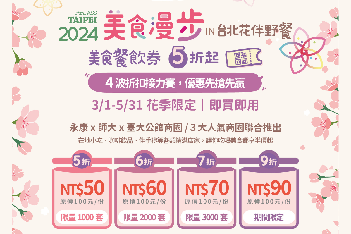 春暖花開,相約來臺北賞花、野餐嚐美食!臺北市政府觀光傳播局指出,今(113)年北北基好玩卡串聯台大公館、永康及師大龍泉三大人氣商圈,推出花季限定「2024美食漫步in台北花伴野餐」美食餐飲電子券,含括特色料理、人氣甜點等逾40間店家,最低可以五折價格,購得面額100元的餐飲券!即日起開放限量搶購,線上訂、即刻用,來臺北賞花同時滿足味蕾!