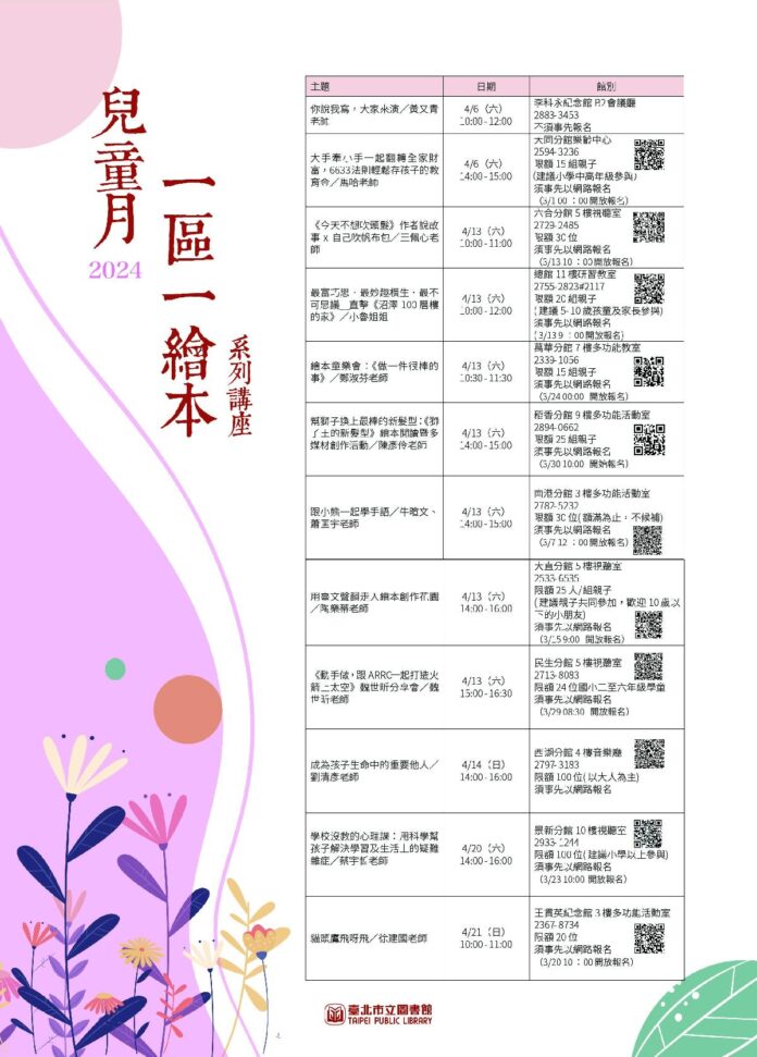 還在煩惱今年四月的兒童月如何安排嗎?來北市圖就對了!臺北市立圖書館自4月6日至4月21日推出一區一繪本系列講座,活動形式橫跨講座、繪本說故事和手作體驗等多種形式,豐富孩童閱讀體驗,提供一場充滿趣味與知識的文化盛宴。