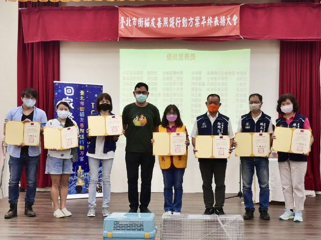 北市動保處陳英豪處長表示,臺北市自95年起推動TCCP,至今已歷經16年,街貓絕育數量累計高達4萬6,993隻,都是由各個民間團體及志工通力合作的成果,今年度參與TCCP的志工數共計305位,完成1,847隻街貓誘捕絕育,其中以臺北市流浪貓保護協會志工數最多,計有198位,另於中正及萬華區由志工阿杜和老郭自發性組成15人志工團隊,並命名為「閹貓小隊」,以「掃街式」方式落實區域性的街貓誘捕絕育,自108年起完成區域街貓絕育並回置照護共1,166隻,讓街貓數量有效控制,近年已經少有幼貓或新移入貓隻出現。閹貓小隊志工們沒日沒夜的辛勞付出,加強區里以及社區街貓絕育工作,讓居民感受到街貓夜晚打架、叫囂、噴尿等狀況明顯改善,居民和街貓更能和平共存,也創造新興的動物友善社區。今日特別頒發優良里長30位、特殊貢獻5位、資深志工10位、優良志工30位、新人獎2位及感謝辛勞志工們,亦感謝公私協力參與的6個協會為街貓絕育辛勞奔波,共同營建臺北市友善社區環境。