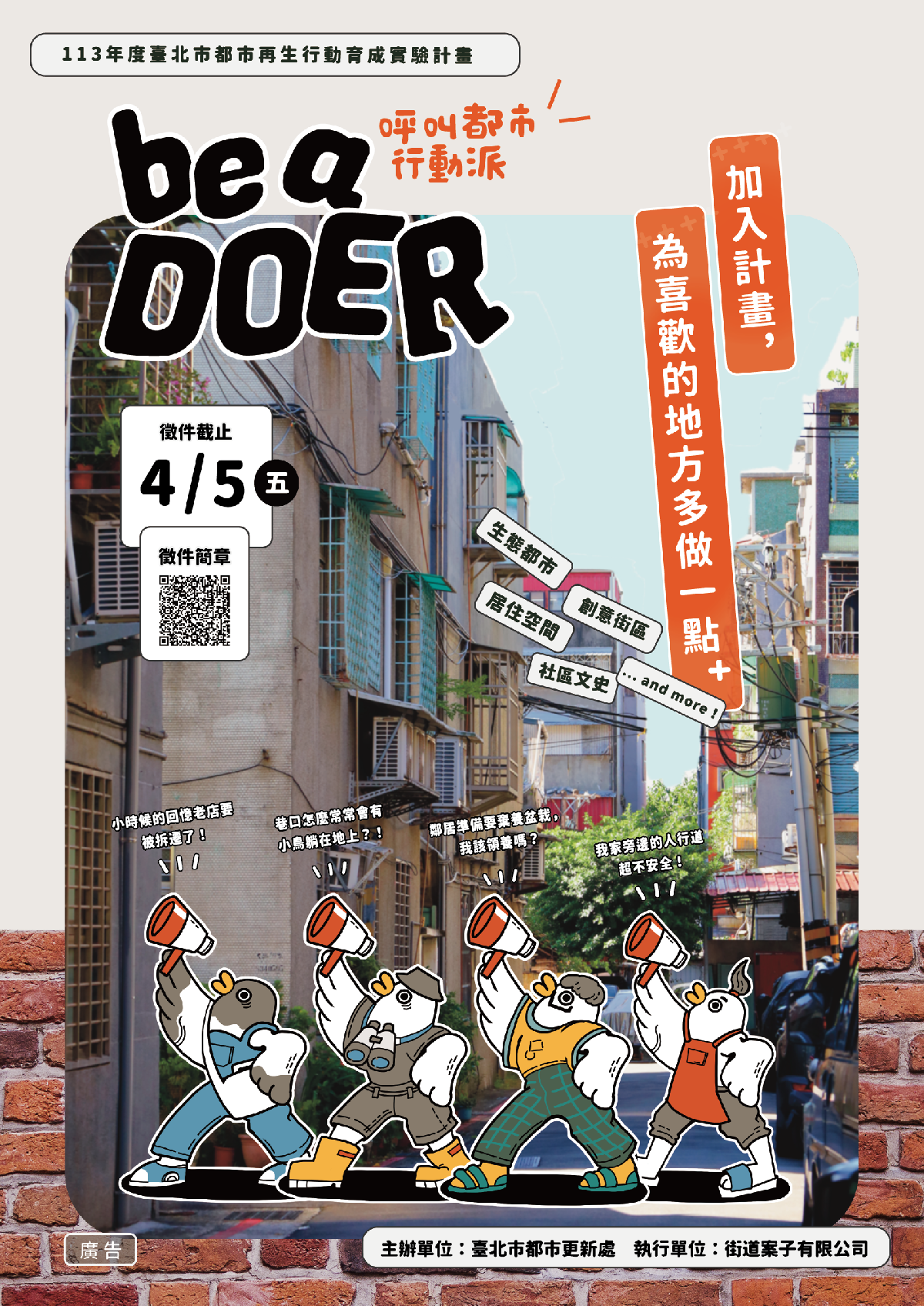 如果你對都市議題、生活環境有問題觀察及改變的想法,歡迎提出你的行動方案!關於本計畫相關資訊,請追蹤「be a DOER」Instagram帳號,以及「台北社造咖」臉書粉絲專頁,或電洽街道案子有限公司林小姐0958-213-950、北市更新處童小姐02-2781-5696分機3131。