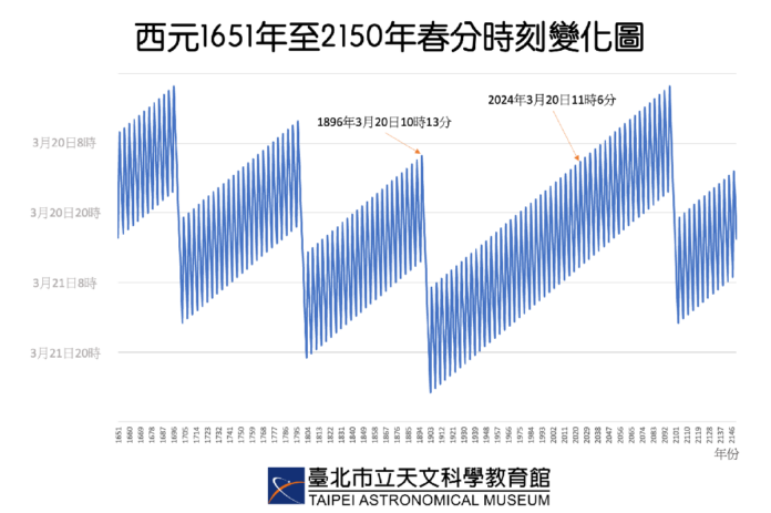 在天文學上,春分點被訂為太陽在天球上移動的原點,太陽沿黃道繞行一圈再回到春分點的「分點年」周期約為365.2424日,比日曆上的平年多了約四分之一天,因此曆法上在相隔四年、一百年與四百年時以閏年規則來修正,經過調整後,儘管每年春分的時刻略有不同,但總都落在3月21日的前後一、兩天內。從西元1651年到2150年春分時刻的統計圖上,便可清楚看出閏年修正的影響,而今年則是自1896年之後,128年來最早的春分,而且變早的趨勢會持續到2096年。