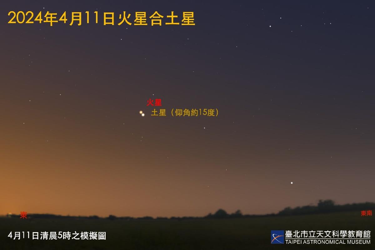 4月11日(四)將發生「火星合土星」,當日破曉前4時至5時許,以肉眼即可看見火星與土星以不到半度的距離,近接於東方低空,相距比滿月視直徑還小!特別的是,這是2001年至2050年半個世紀間,兩星最接近的三次之一,相距僅略大於2022年與2036年,不過卻是三次中兩星亮度最接近的一次,火星1.2等、土星1.1等幾乎等亮,屆時紅色的火星與灰黃色的土星相互爭輝,同為東方天空最亮的明星。