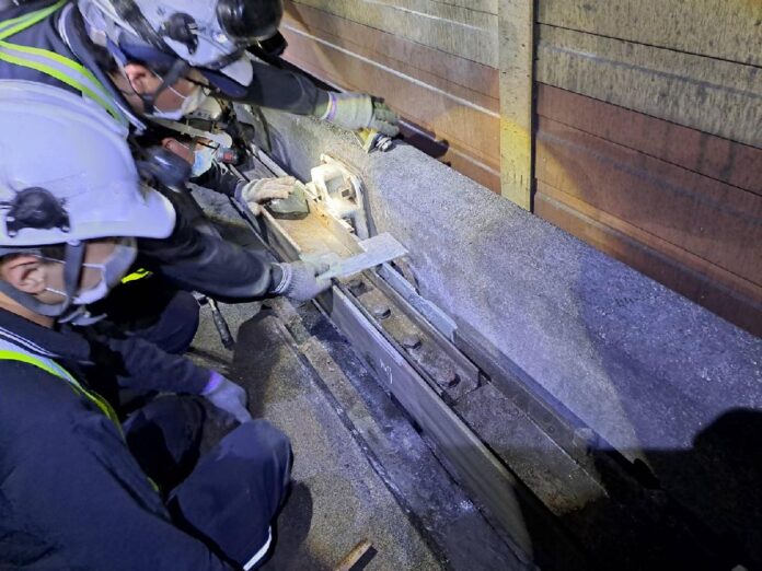 10日晚間文湖線行控中心迅速處理萬芳社區站附近軌道發生煙霧 確認列車集電靴刷過因零星火花導致溝槽落葉冒煙 已安排加強清理