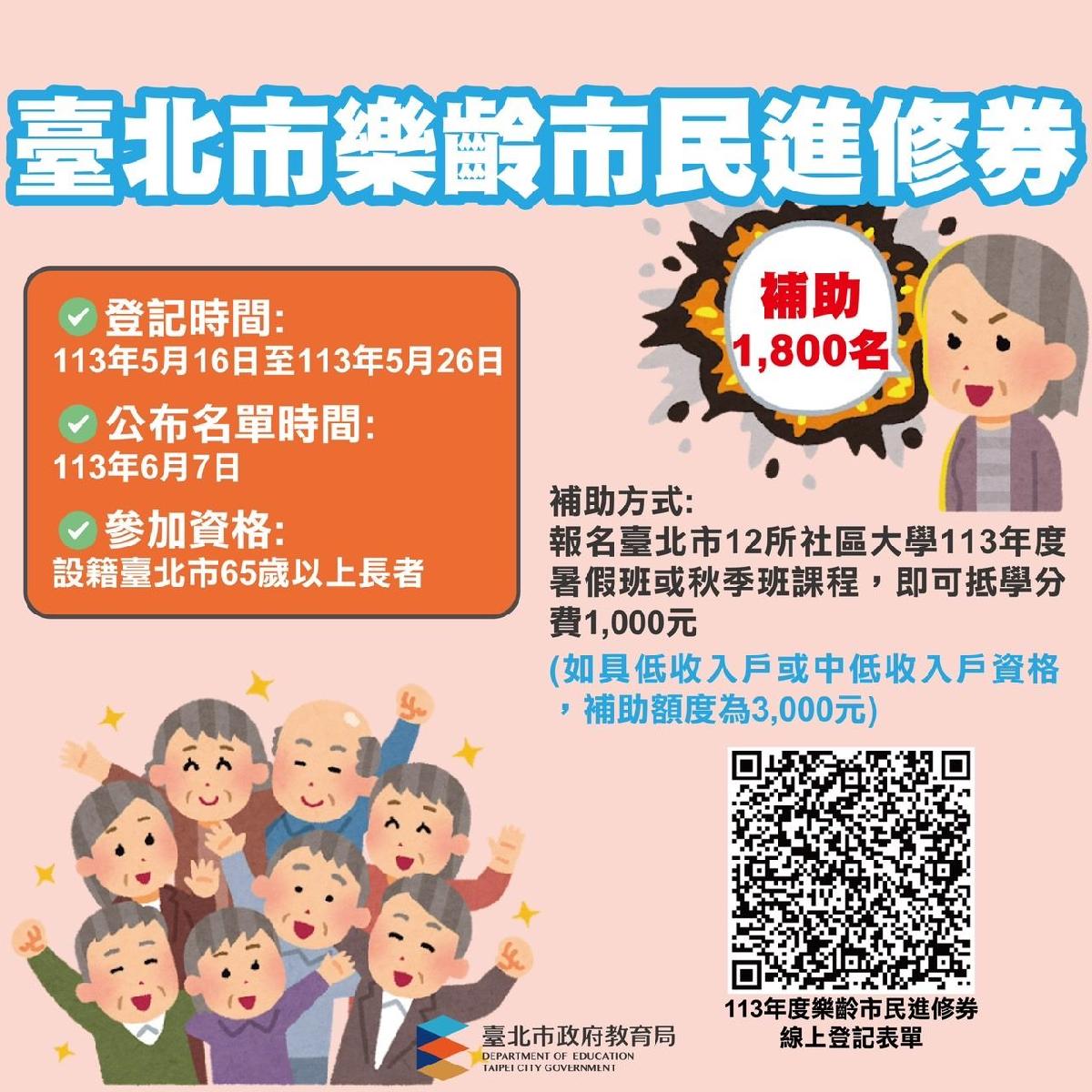 【主題:北市65歲以上長者必看!樂齡市民進修券提高補助1,800名,補助金最高3,000元,5月16日起開放登記囉!】