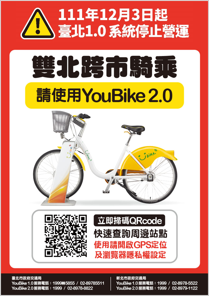 臺北市政府交通局表示, YouBike2.0系統已於111年10月提前達成全市1,200站擴建目標,服務超過13年、騎乘次數超過2億人次之YouBike1.0系統將功成身退,111年12月3日(星期六)0時起停止營運,屆時臺北市各YouBike1.0場站之自行車將無法再借出,借用中之YouBike1.0自行車請民眾就近歸還尚有空位之YouBike1.0場站,另呼籲欲從新北市騎乘往臺北市之民眾改使用YouBike2.0。若民眾尚有YouBike1.0欠費,請儘快持欠費卡片於臺北市之YouBike1.0車柱靠卡補扣,避免YouBike1.0車柱陸續拆除後,造成補繳之不便。