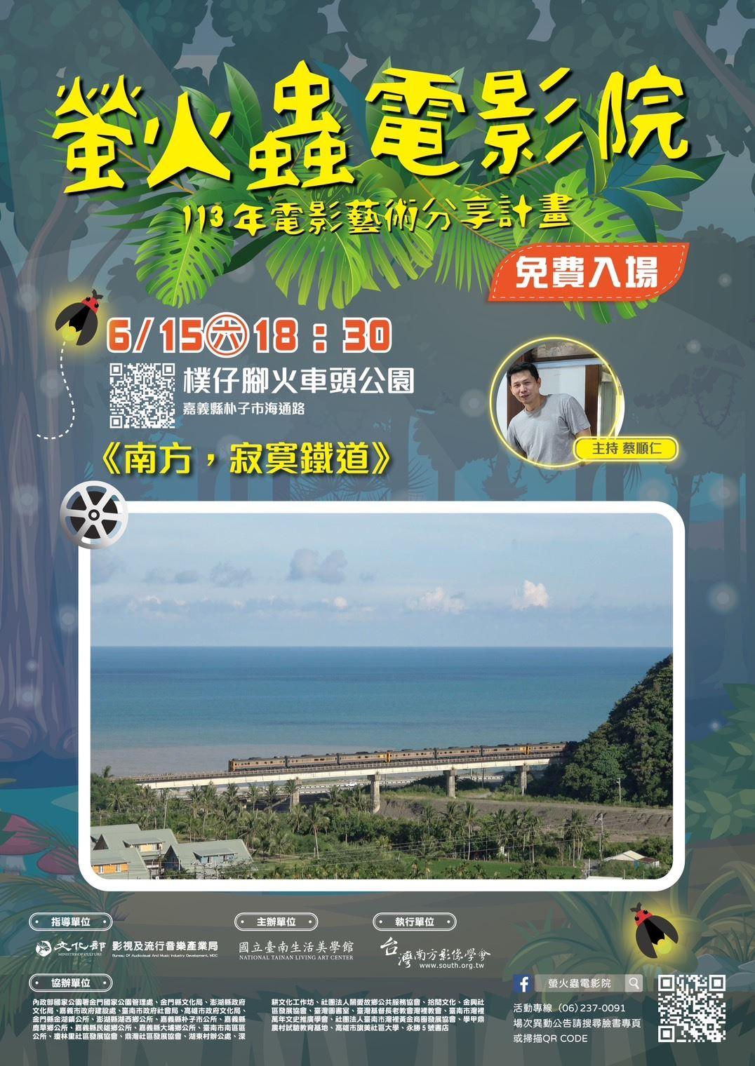 首場6月15日(六) 晚上6時30分假嘉義縣樸仔腳火車頭公園播映《南方,寂寞鐵道》,這是一部深刻記錄臺灣鐵道文化的紀錄片,由連續兩屆得到金馬獎最佳紀錄片獎著名導演蕭菊貞執導。這部影片透過鐵道旅行的視角,探討了臺灣南部地區的人文風景與社會變遷,並特別聚焦於南迴鐵路的歷史與發展。這部影片集結珍貴影像、聲音、音樂於一體,以深度人文觀點保存鐵道文化的紀錄片,呈現南臺灣生活記憶與感動,是一部值得觀賞的紀錄片,對於有興趣了解臺灣鐵道文化和歷史的人來說,將是一次難忘的視覺與心靈之旅。映後座談由獨立紀錄片工作者蔡順仁編導擔綱主持人,歡迎大家在周末夜晚一起欣賞電影,用行動支持國片。