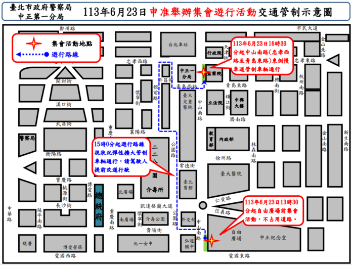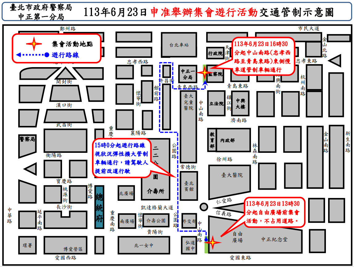 有關113年6月23日中山南路等路段舉行集會遊行活動實施交通管制、疏導措施說明