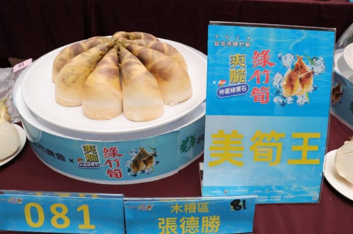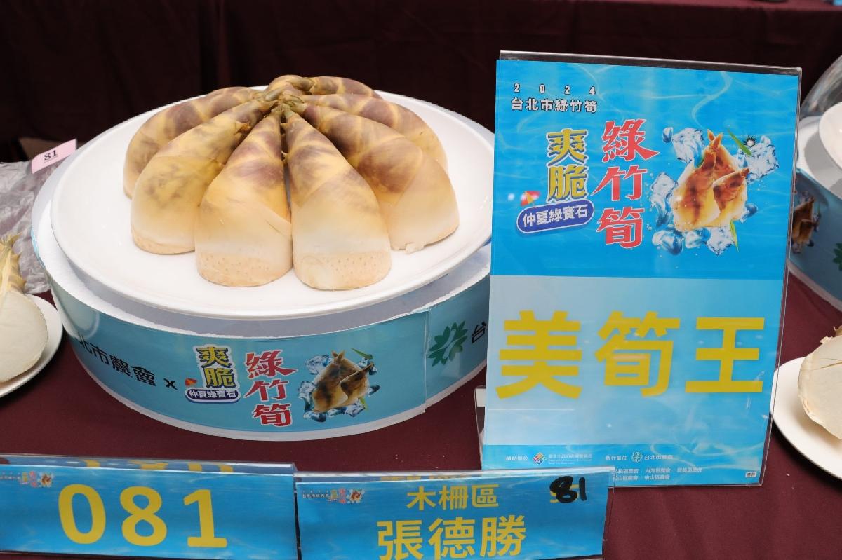 今(21日)天在臺北市政府1樓中庭舉辦「臺北市綠竹筍品質評鑑比賽」,有來自全市9個區農會多達107位前來互相交流筍農高手參賽(包含木柵、士林、北投、內湖、景美、南港、大安、松山、中山),經過專家評審團一整個上午的評鑑,最終是由木柵區農會陳俊良奪下「綠竹筍王」冠軍寶座,而甜度最高的「甜筍王」則由木柵區農會高滿堂奪得,甜度高達7.1度,是全國今年度最甜的綠竹筍!去年才新增以外觀為評鑑標準的「美筍王」獎項,則由木柵區農會張德勝奪下今年「美筍王」的榮譽。