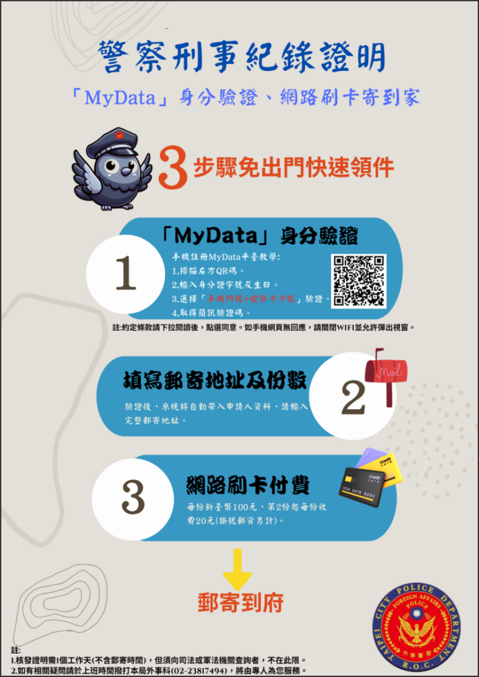 由於警察刑事紀錄證明記載資料屬重要個人隱私,過往申請規定均須親自或委託親友攜帶身分證,前往警察局或分局驗證身分。為提供免出門快速又方便的簡政便民服務,本局自112年起配合內政部警政署政策,結合數位發展部「個人化資料自主運用」(MyData)平臺提供之身分驗證功能,民眾可直接在警察刑事紀錄證明申辦網站上,透過MyData平臺核驗身分,填妥申請資訊,最後信用卡線上繳費,即完成申請程序。本局受理後,經過審核及製證作業,以掛號郵件寄達指定地址;113年迄今已有4,850人次使用本項便民服務。