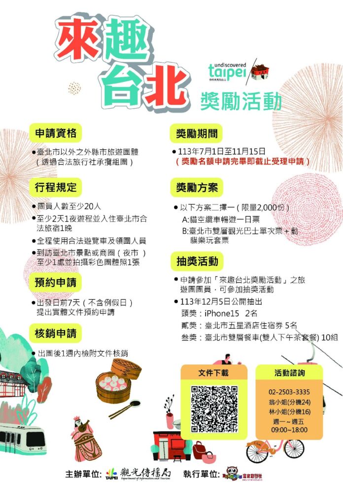 觀傳局表示,為了提振北市國旅,外縣市旅遊團體只要符合來臺北市至少玩2天、入住臺北市合法旅宿1晚,並到訪臺北市景點、商圈或夜市1處,就可向觀傳局申請「貓空纜車暢遊一日票」,或「臺北市雙層觀光巴士單次票及動貓樂玩套票」等獎勵票券,限量2,000份;此外,更加碼推出抽獎活動,申請「來趣台北獎勵活動」的旅遊團員還有機會抽iPhone手機、臺北市五星酒店住宿券、臺北市雙層餐車下午茶套餐等好禮,總價值超過12萬元。