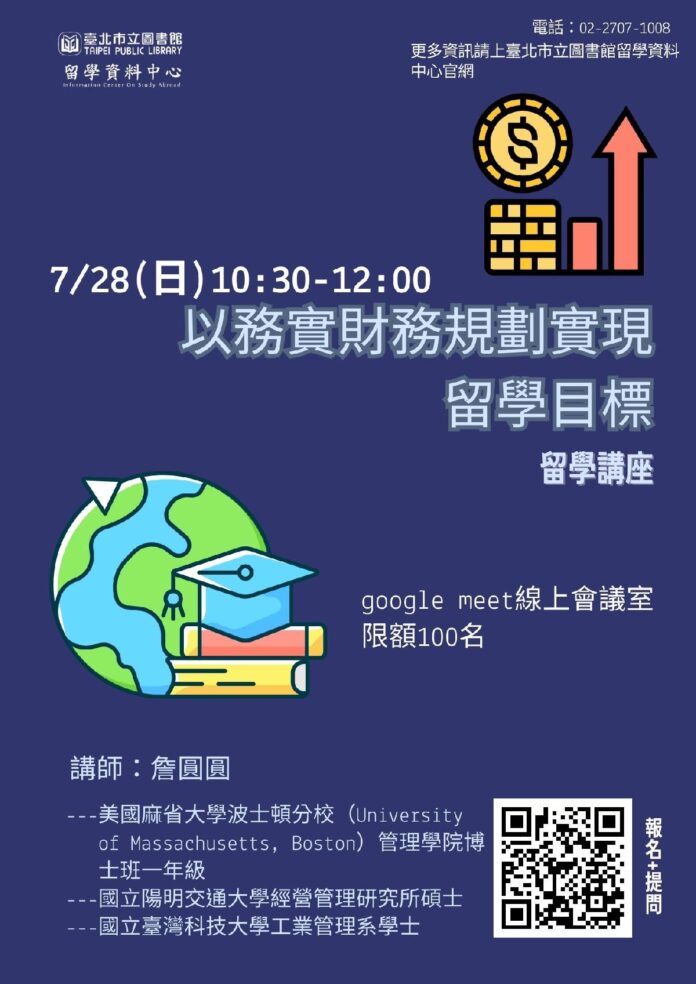 臺北市立圖書館留學資料中心於7月28日(日)上午10時30分邀請目前就讀於美國麻省大學波士頓分校管理學院博士班詹圓圓講師,分享美國大額獎學金來源、留學前後各項資金支出,提供預計前往美國留學的學生在財務管理上的規劃。歡迎計劃前往美國留學的學生與一般民眾連線參與!