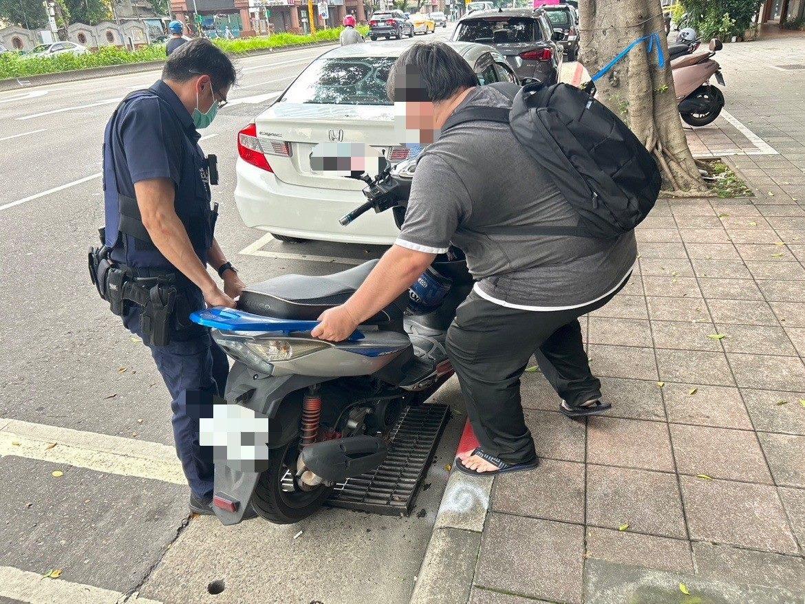 到場後發現一名男子(鄭姓、35歲)正試圖挪移一輛普通重型機車,然該機車卻絲毫紋風不動,員警隨即上前關懷並詢問所需協助之處?鄭男立即表示,因停放機車時不慎將中柱卡在水溝蓋裡,而致無法脫困,十分尷尬。情急之下,只好撥打110報案請求協助。