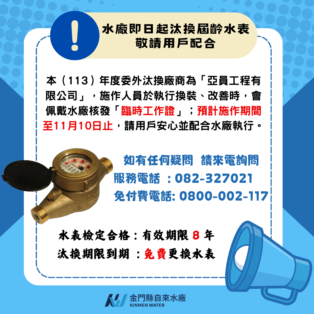 東部新聞金門縣水廠即日起汰換屆齡(8年)水表,敬請用戶配合 東部新聞金門縣 水廠即日起汰換屆齡(8年)水表,敬請用戶配合 編輯 謝 國忠 2024-07-19 水量計(俗稱水表)是法定度量衡器之ㄧ,作為水費計價的依據,依據水量計檢定檢查技術規範,水表檢定合格有效期間為8年,水廠為確保水表計量的正確性,在水表檢定合格有效期到期前,會主動辦理水表更換作業。 本(113)年度委外汰換廠商為「亞員工程有限公司」,施作人員於執行換裝、改善時,會佩戴水廠核發「臨時工作證」;預計施作期間至11月10日止,請用戶安心並配合水廠執行,如果用戶對汰換作業有任何疑問,可以撥打水廠電話327-021查詢或上水廠網站查詢。 延伸閱讀 商情 想同時增肌又減脂?年後體態管理關鍵曝光 客製高蛋白營養方案助代謝重啟 商情 年後減肥不挨餓!台北中山區高蛋白健康餐推薦 助上班族重啟代謝找回體態 商情 年後體態管理怎麼做?專家推高蛋白健康餐助攻代謝重啟,台北中山區減脂餐新選擇 商情 台中機械五金批發賣場推薦|益佃五金提供全方位刀具、量具與客製化服務,全台速配直送