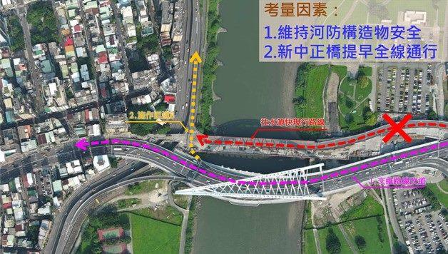 中正橋新橋之新北往臺北方向,自7月20日起,除外側新增一機車專用道,其餘維持現況動線通行