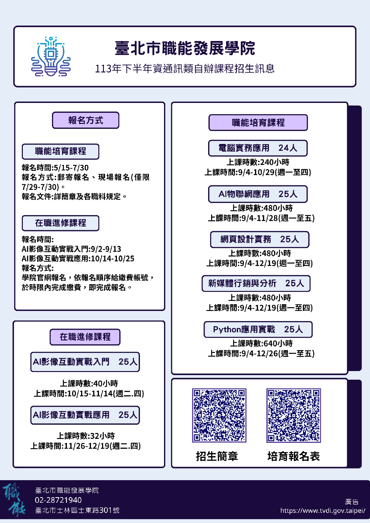 臺北市職能發展學院113年下半年自辦職前訓練與職能進修課程現已開放報名!我們提供多元化的資通訊課程,助力市民朋友習得相關領域之專業能力,以提升就業競爭力。本次開課課程含括文書應用處理、新媒體行銷分析、網頁設計、AI物聯網應用及Python程式語言等多個領域,並由經驗豐富的師資提供切合市場需求的實務訓練,為學員打造扎實的職訓體驗。