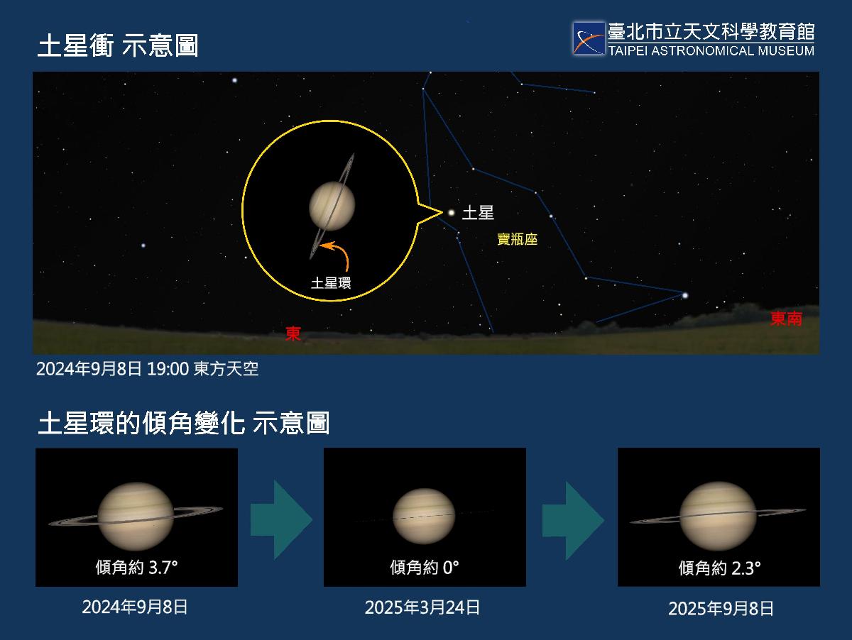 9月8日(日)土星衝前後,是土星今年最接近地球的時段,視直徑最大,達19.2",亮度也最高,約0.6等,整夜可見。以小型望遠鏡可以看見傾角僅3.7°的美麗土星環,到了2025年3月底,土星環將完全側向地球而短暫消失,之後轉為以南側面向地球,並持續到2038年下旬,所以本次土星衝是近期觀賞土星環北面的最後機會!