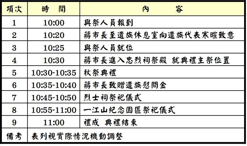 臺北市113年秋祭忠烈陣(公)亡將士大典,訂於9月3日上午10時30分假臺北市忠烈祠(臺北市南港區研究院路3段130號)舉行。秋祭大典為表達對陣(公)亡將士崇敬緬懷之意,安排莊嚴隆重之儀式,告慰英靈,亦慰問遺族家屬。祭典將由蔣市長主祭,典禮中除邀請遺族代表、軍方代表外,還特別邀請臺北市議會議員及各界代表與祭,鳴鐘擊鼓,為靈位上香、獻花、獻果、獻爵等祭禮。典禮結束後蔣市長將與遺族家屬握手致意,並致贈慰問金。接著前往一江山紀念碑,祭悼一江山戰役為國捐軀的先烈將士,並向遺屬一一握手致意慰問。