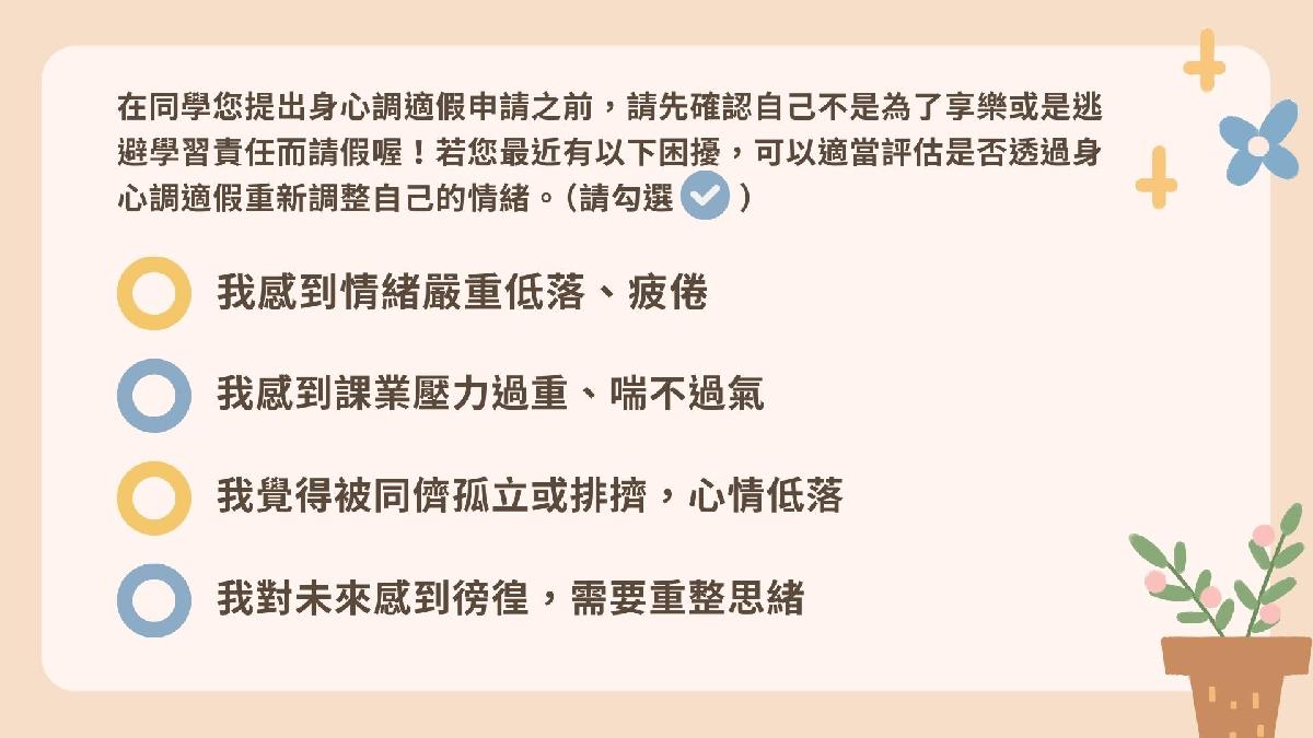 【主題:高中職身心調適假上路,北市推身心調適宣導小卡,讓學生重「心」出發】