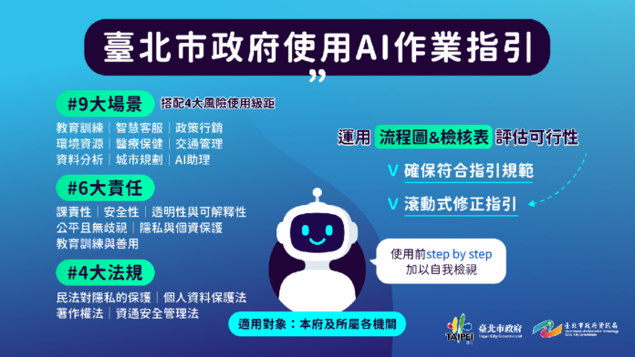 臺北市市長蔣萬安於今9月9日發布「臺北市政府使用人工智慧作業指引」,針對臺北市各機關應用AI九大情境,提供明確的應用原則、操作流程及檢核標準,保障人工智慧技術在市政運作中的效率及安全性,並進一步促進市府治理和公共服務的智慧化。