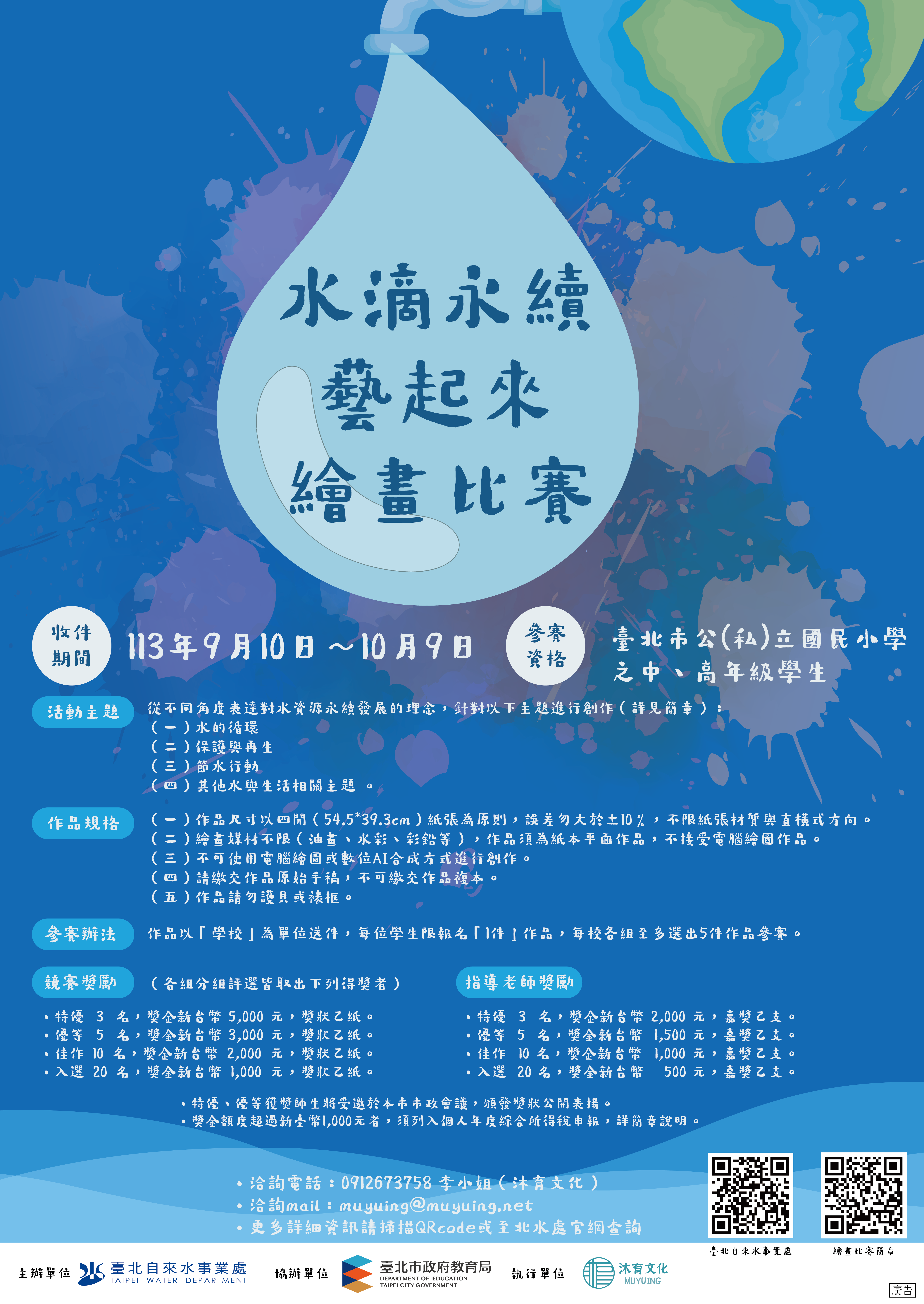 臺北自來水事業處為倡導水資源永續發展,針對臺北市國小學童首次辦理繪畫比賽,透過藝術的發想讓愛水惜水的觀念從小紮根深植。為鼓勵學童踴躍參與及激發創作能力,特優獎除了獲得獎狀外,還可拿到獎金5千元!