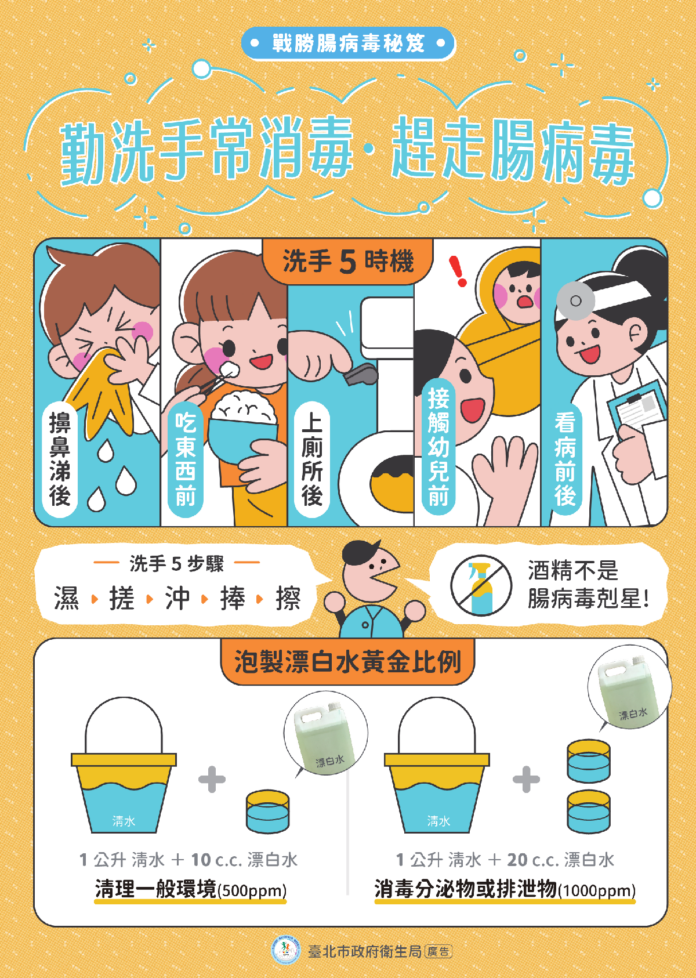 臺北市政府衛生局提醒,預防腸病毒及腸胃炎最重要的方法是大人小孩都用肥皂勤洗手,確實做到「濕、搓、沖、捧、擦」洗手五步驟,注意個人衛生,並應注意居家環境清潔及通風,大人返家後應先更衣再接觸家中幼童,以降低家中幼童感染的機會。有關腸病毒及病毒性腸胃炎防治資訊相關防治資訊,可至臺北市政府衛生局首頁/主題專區/傳染病預防項下查詢,或洽詢臺北市防疫專線(02)2375-3782。