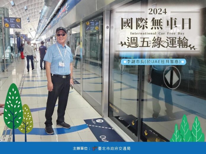 9月22日就是國際無車日,臺北市長蔣萬安今日率領市府團隊首長共同參與綠運輸,用相機拍攝自己搭(騎)乘捷運、公車、自行車或步行等綠運輸的照片,身體力行響應無車日,以實際行動帶動市民一起使用綠運輸通勤。而帶領百人團赴杜拜參加2024第30屆智慧運輸世界大會的李四川副市長,亦率領交通局長、資訊局長等人一同在杜拜響應使用當地的綠色運具。