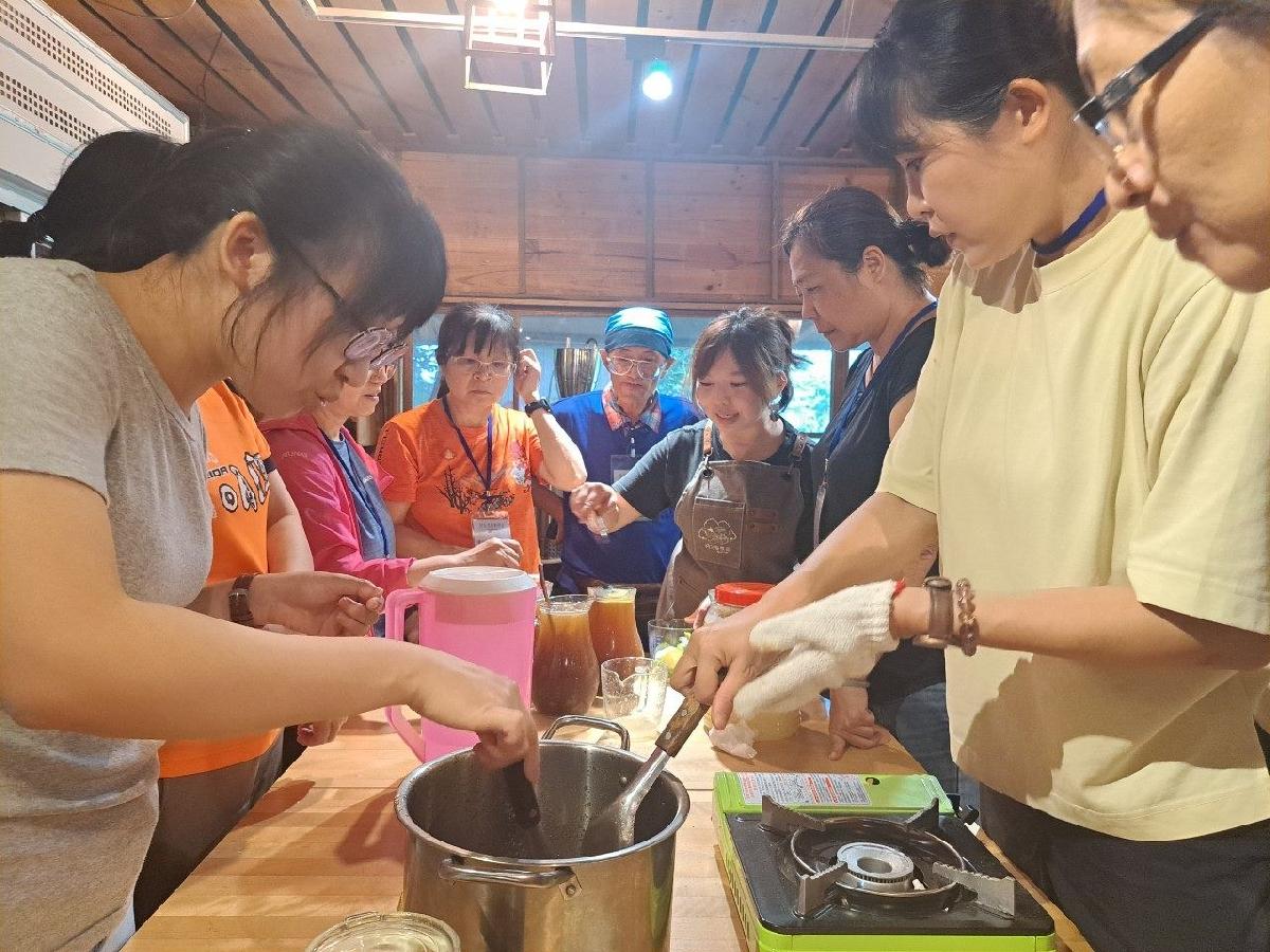 今年獲得「新北嚴選」美食名店的淡水阿三哥農莊,負責人張哲岳為開平餐飲校友,過去為烘焙專業的他,現在成為在地青農。因同時擁有餐飲與友善農作經驗,多面向的豐沛知識能更系統的綜理從產地到餐桌知能,故活動從農業自給率、作物特性與培養知識,到如何使用當地當季食材入菜,設計了實地導覽及專業實作的豐富體驗。尤其下午將現場老師們分成四個組別,分別製作茶油麵線煎、手做南瓜派、檸檬冬瓜露、洛神花司康,都是考量惜食與時令且易於入門的品項,教學中也大方分享製作比例如何調整規劃,利於國中老師能納入課程設計,參與研習的北投國中李佩純老師即於回饋說道:「很用心,知識和實作都很紮實。」