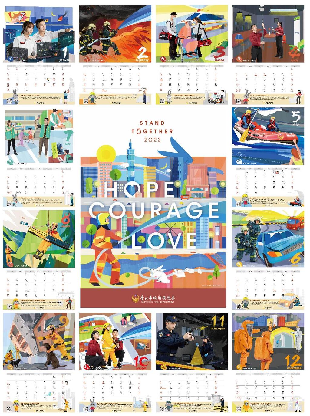 臺北市政府消防局2023年防災月曆,以不同視角及想像畫面,與台灣本土知名插畫家HANNA CHEN共同合作,首創以真實生動的插畫及唯美柔和的色調,結合消防人員執行火災搶救、水域安全、緊急救護等各項任務的影像樣態,於每月份呈現消防員彼此間攜手同行搶救生命熱血情誼,希望透過這份充滿初衷的防災月曆來溫暖您我,也藉由影像及藝術結合來傳遞更多的防災知識,讓我們與消防員站在一起共同打造幸福、安居的防災城市。